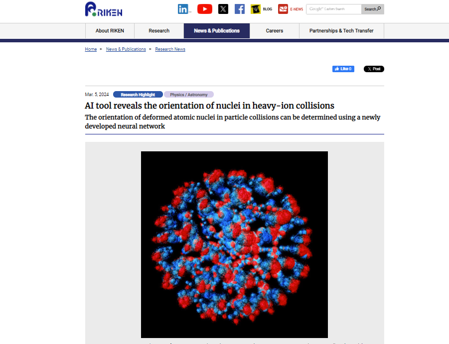 近日,我院核物理团队的范小华老师与日本理化学研究所(RIKEN) 仁科加速器科学研究中心合作的最新研究成果“A neural network approach for orienting heavy-ion collision events”在核物理顶级期刊Physics Letters B上发表。日本理化学研究所杨祖星博士为该成果第一作者,西南大学范小华老师为唯一通讯作者,西南大学李志攀教授和日本理化学研究所西村俊二教授为共同作者。研究成果受到日本理化学研究所的高度认可,被评为Research Highlight工作,并重点报道 (https://www.riken.jp/en/news_pubs/research_news/rr/20240305_1/index.html)。该研究工作得到了国家自然科学基金、日本JSPS科学研究基金、RIKEN专项、INT项目、中央高校基本科研业务费等项目资助。