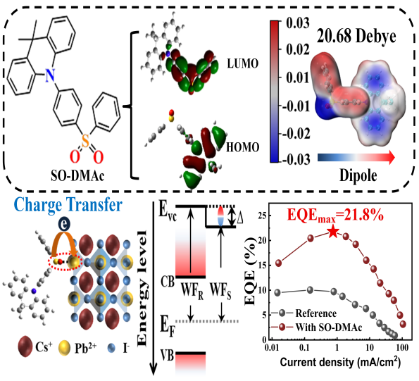 金属卤化物钙钛矿发光二极管(PeLEDs)的带隙和工作稳定性受到钙钛矿中大量表面或体相缺陷的影响。目前的缺陷钝化策略主要依赖于小分子或聚合物配体的配位作用。该策略尽管可以有效地提高钙钛矿的光学性能,但配体分子的绝缘属性增加了配体/钙钛矿界面处的电荷注入势垒,因此牺牲了PeLEDs的运行稳定性和外部量子效率(EQE)。在本工作中,我们利用热激活延迟荧光分子SO-DMAc对PeLEDs进行优化。SO-DMAc中的O=S=O基团通过Lewis作用与钙钛矿底界面处暴露的Pb2+配位,从而钝化表面缺陷。同时由于SO-DMAc分子在钙钛矿和空穴传输层界面形成定向的强偶极层,故而SO-DMAc与钙钛矿之间发生快速的电荷转移。上述特性使得SO-DMAc分子在钝化缺陷的同时,又优化了器件的能级结构,降低了界面电荷注入势垒,使得空穴更有效地注入到钙钛矿中。得益于上述协同效应,该工作最终获得了682 nm稳定发射的深红光PeLEDs,其最大EQE为21.8%,电致发光亮度半衰期和EQE半衰期分别超过6小时和35小时。此外,为了更深入研究该类分子钝化剂的作用原理,该工作还对比了两种不同添加剂分子:DPS和DMAc-TRZ。前者具有O=S=O基团,能够与钙钛矿表面配位,但正负电荷中心重叠(弱分子偶极矩)。而后者则是正负电荷中心分开(强分子偶极矩),但缺少与钙钛矿的配位官能团。结果表明,只有添加剂分子同时满足:与钙钛矿配位和强分子偶极矩,才能实现界面电荷转移过程,从而提升载流子注入效率。该研究也为后期多功能分子配体的选择和设计提供了新的见解。