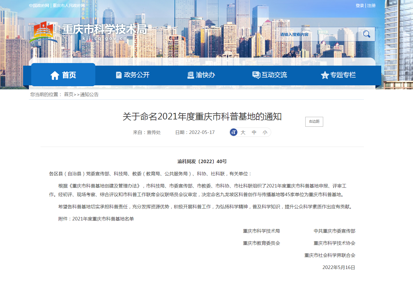 近日,市科技局、市委宣传部、市教委、市科协、市社科联发布《关于命名2021年度重庆市科普基地的通知》,我院“西南大学科普空间站”科普基地成功获批重庆市科普基地。