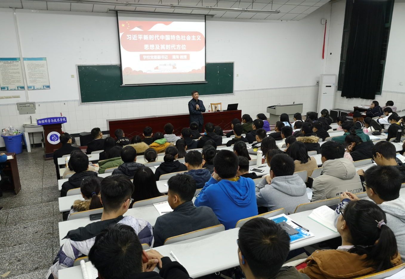 11日23日晚,学校党委副书记潘洵教授莅临学院大阶梯教室,为我院师生作了题为《习近平新时代中国特色社会主义思想及其时代方位》的专题党课。专题党课由学院党委副书记、纪委书记刘汭雪主持。院党委书记李建光,学院全体学生党员、发展对象、入党积极分子近300人认真聆听了党课。