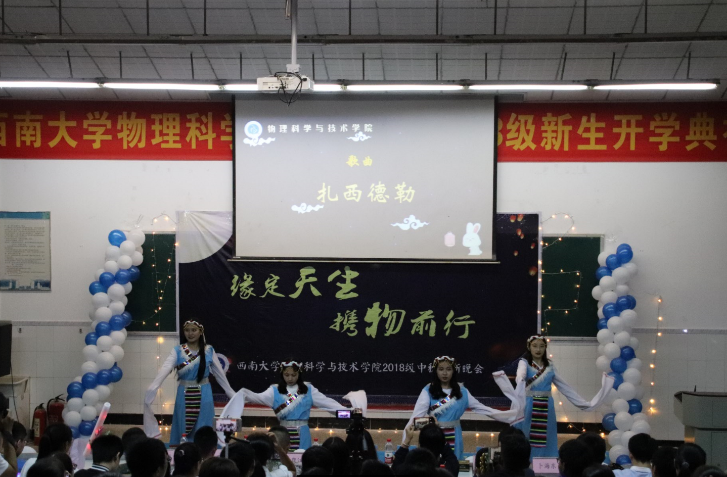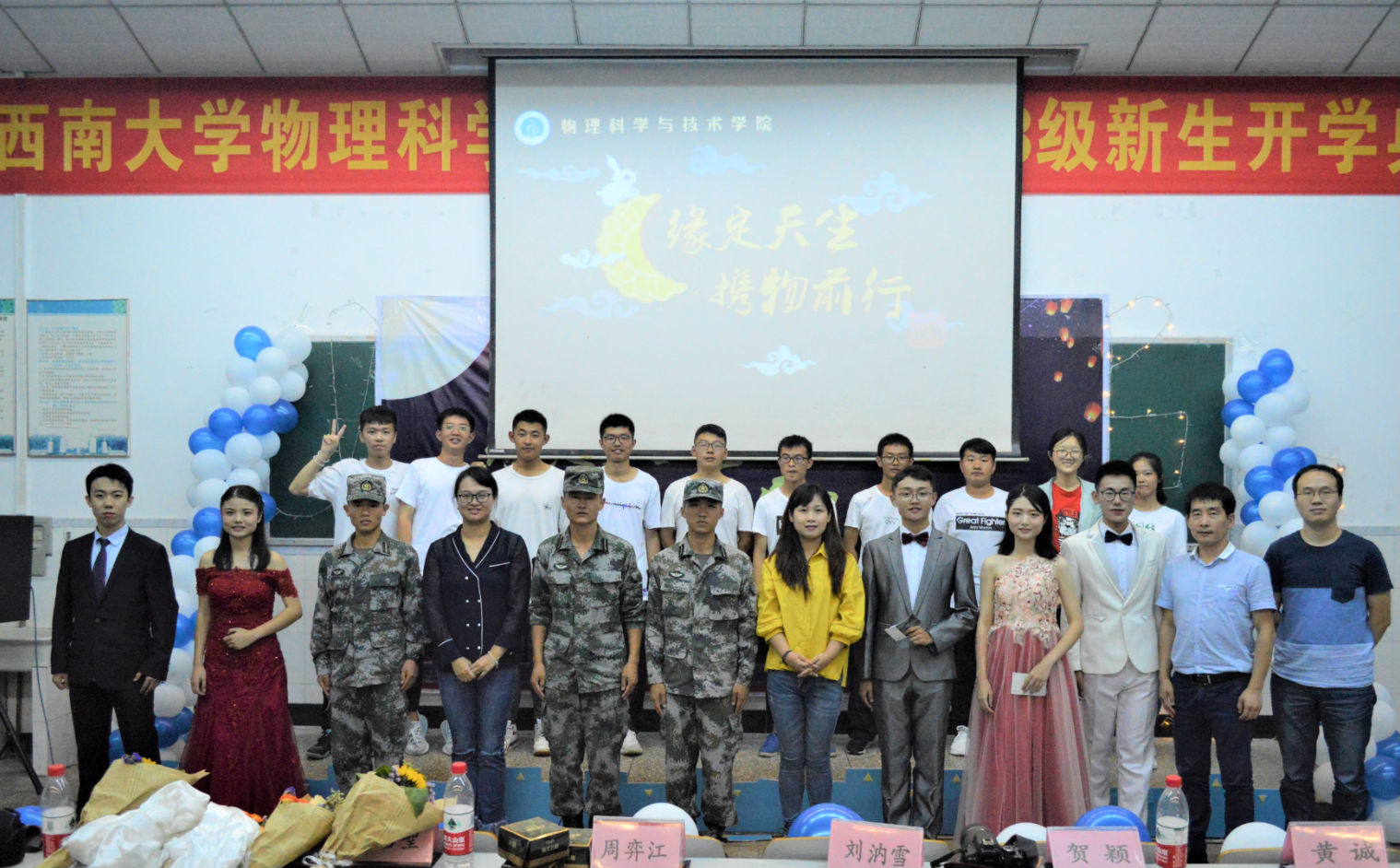 9月24日晚,学院“缘定天生,携物前行” 2018级中秋迎新晚会在物理大楼大阶梯教室隆重举行。学院党委副书记刘汭雪,院团委书记贺颖、2018级辅导员卜海东、2018级物理学1班班主任黄诚,一团十四连承训教官以及2018级全体新生共计300余人一同参加了晚会。