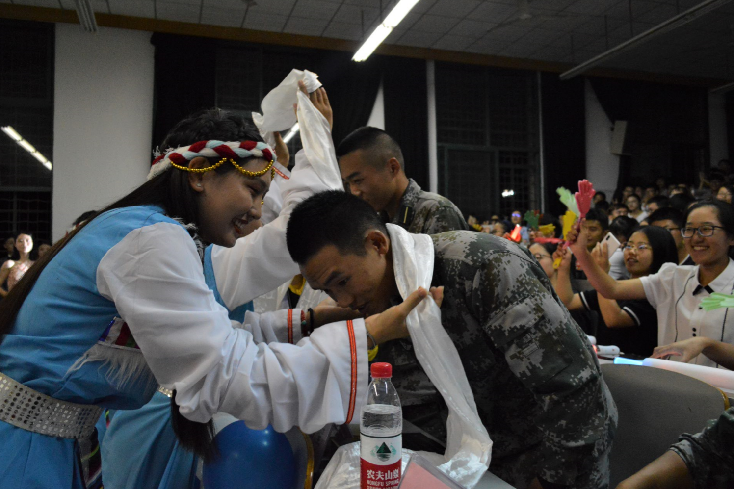 多轮互动游戏和微信抽奖更是让晚会高潮迭起。老师、教官和同学们一同参与“踩报纸”游戏,其乐融融。在“微信上墙,抽奖送礼”活动中,大屏幕实时滚动更新,意外惊喜和感动常在。“孩子,我想对你说”家长视频播放,远在家乡的父母发来爱的叮咛与嘱托,让同学们备受鼓舞。晚会在小合唱《夜空中最亮的星》美妙歌声中圆满落下帷幕。