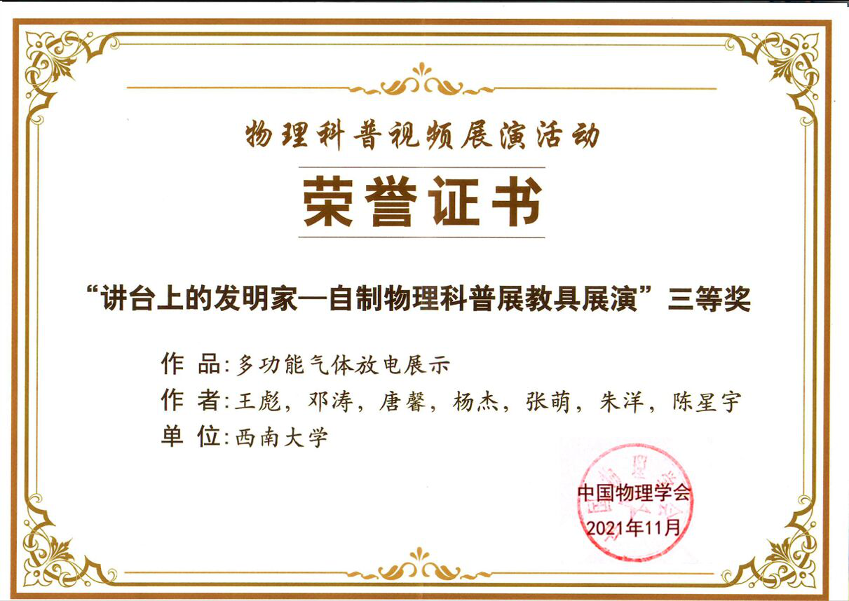 pa视讯官方集团三个作品经过各位老师和同学的精雕细琢,反复打磨,在大会中表现优异。由张巧明、杨继勇老师指导的《被中香炉-文物中的物理》获得“科学三分钟——物理科普讲解视频展演活动”二等奖,《天空为什么是蓝的》获得“科学三分钟——物理科普讲解视频展演活动”优秀奖,由王彪、邓涛老师指导的《多功能气体放电演示》获得“讲台上的发明家——自制物理科普展教具展演活动”三等奖。