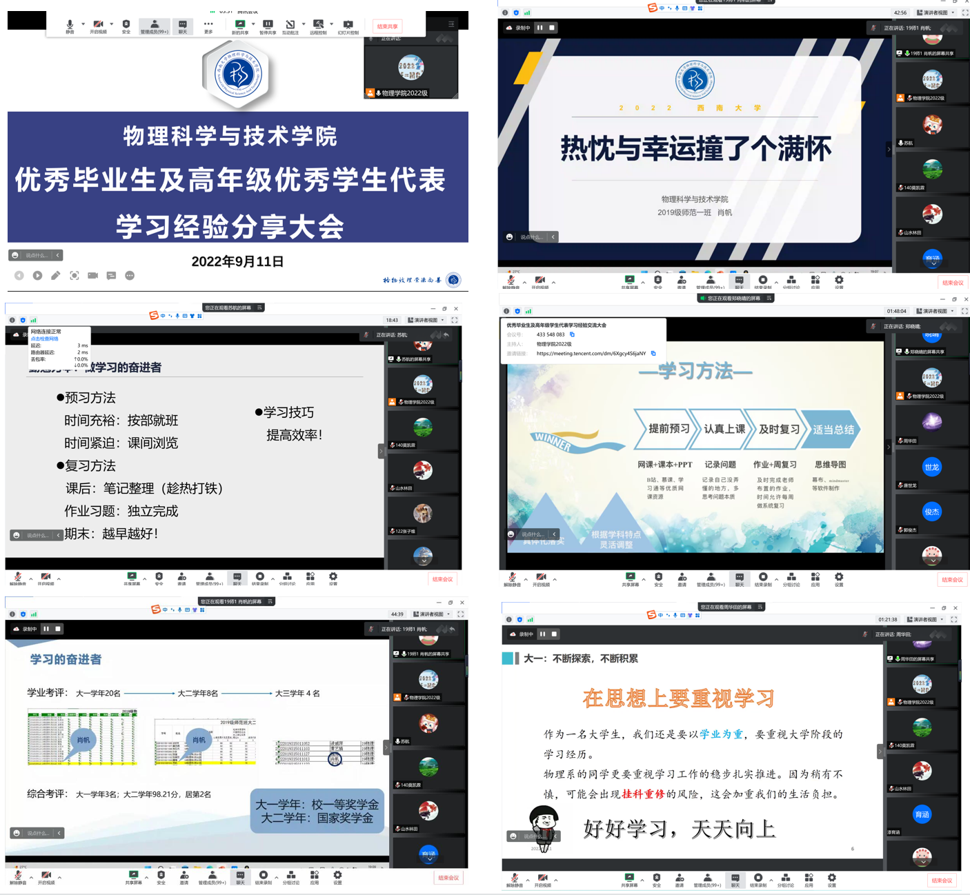 9月11日晚上,学院精心为2022级新生筹备了“优秀学姐、学长齐分享活动”,邀请了优秀毕业生代表、18级苏航以及各年级优秀学生代表(19级肖帆、20级周华田,21级郑晓晴),结合自身经历和专业特点,从不同角度分享学习经验,为新生“零距离”树立榜样。