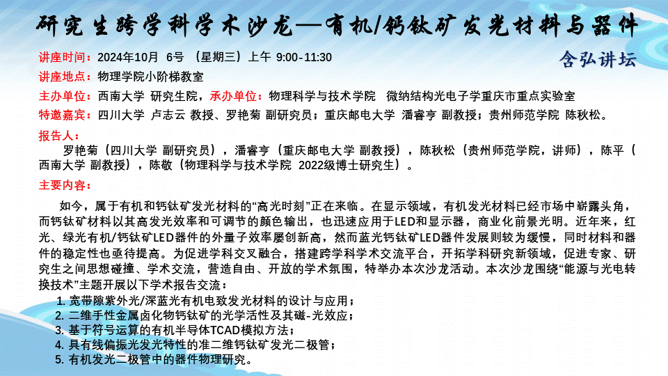 【研究生跨学科学术沙龙】有机/钙钛矿发光材料与器件