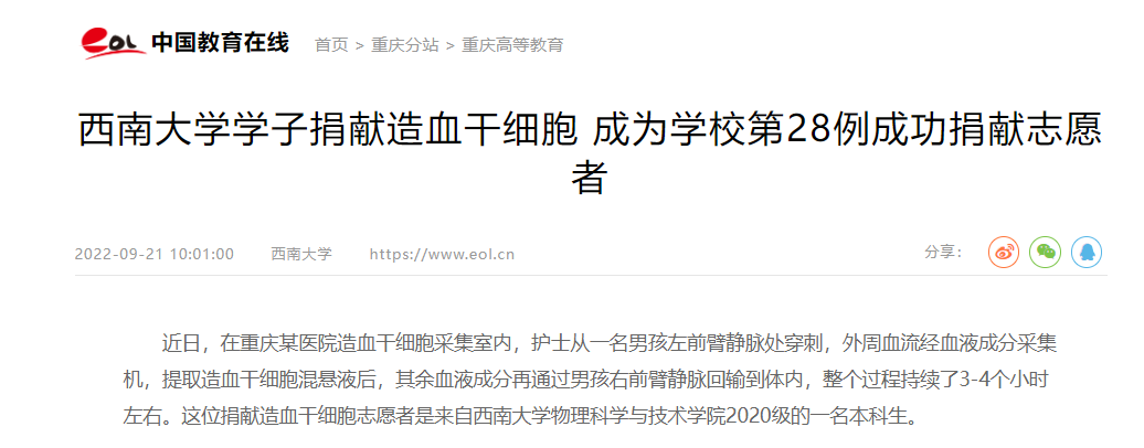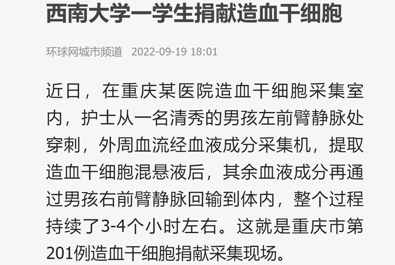 该同学是学院20级的一名公费师范生,来自重庆渝北,为人踏实上进,热心公益事业,平时一直在积极参与学校组织的“西小兰”和“红帽子”等各种志愿服务活动。早在2020年10月,刚进入大学一个月的他就在西南大学红十字会倡议下,自愿参与了中国造血干细胞捐献者资料库采集,成为了一名光荣的造血干细胞捐献志愿者。